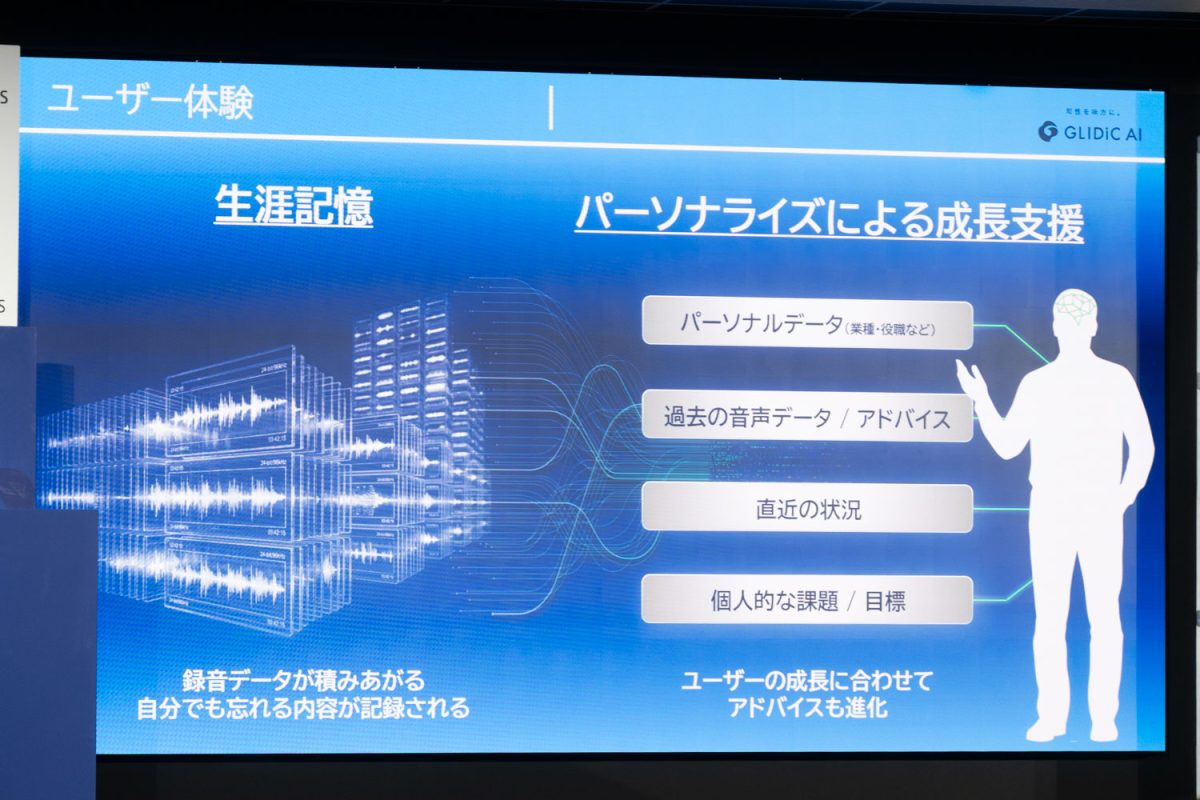 市場には多くの競合製品が存在する一方で、同社では「生涯記憶」という考えで差別化を図っている。これは記録が1回限りではなく、録音データを積み上げることで、自分でも忘れる内容を記録していくというもの。パーソナルデータ、過去の音声データやアドバイス、直近の状況や個人的な課題といった情報をもとにAI処理を行っていく。