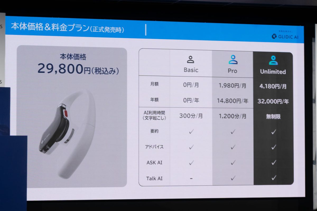 一般発売時の価格は29,800円(以下、税込表記)を予定する。先行販売では最もお得なプランで30%オフの20,860円から購入可能。利用にはプランへの加入が必要で、無料で使えるベーシックプランは月300分まで文字起こしできる。月1200分利用できるProプランは月額1,980円、無制限のUnlimitedプランは月額4,180円となる。