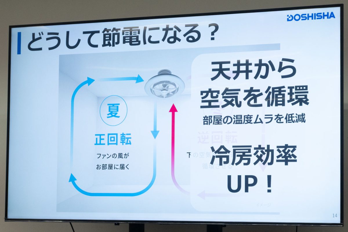 本製品を使うことで、冷暖房の効率が良くなり、設定温度を夏は高く・冬は低く設定できるとのこと。たとえば、ファンの電気代が1日あたり約3.6円のため、エアコンの冷房設定を1度上げる(約8.39円)よりも節電になるとしている。
