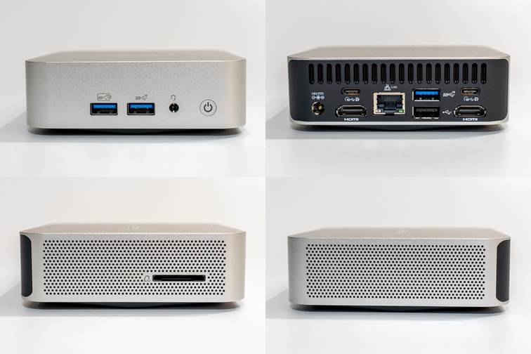 左上:正面(USB-A×2と3.5mmジャック、電源ボタン)、右上:裏側(電源ポート、HDMI×2、USB-C×2、USB-A×2、LANポート)、左下:向かって左側面(SDカードスロット)、右下:向かって右側面