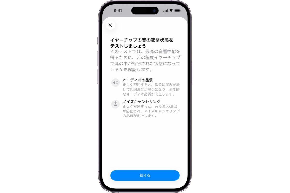 うまく装着できたなら、ペアリングしたiPhoneまたはiPadの設定アプリから、画面に表示されるAirPods Proの名前をタップし、「イヤーチップ装着状態テスト」または「音の密閉状態をテスト」を行う。これを完了すれば、オーディオの品質とノイズキャンセリングの設定がユーザーに最適化された状態になっているはずだ。