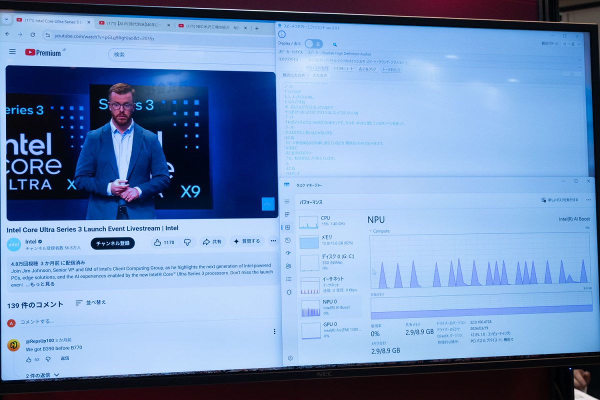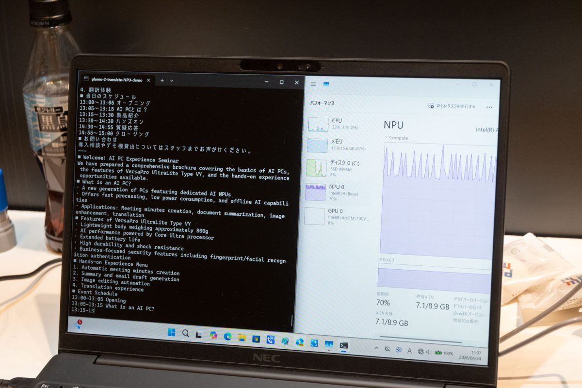 またパートナー企業の展示では、AI PCが搭載するNPUを活用し、ローカルでAIの推論処理を行うソリューションが各種展示。Preferred Networksが開発中の国産AI翻訳サービス「PLaMo翻訳」のローカル実行サンプルや、K-kaleidoのローカル文字起こしソフト「スピーチコネクト」など、多数の企業が出展を行っていた。