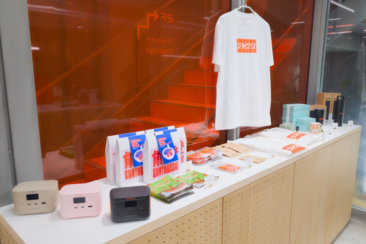 1階はカフェと物販のエリアとなっており、コーヒーのドリップパック、Tシャツ、タンブラー、金太郎飴といったオリジナルアイテムを販売。同社が能登町と連携して開発した非常食「KNOTOメシ」も購入できる。ポータブル電源の販売は行っていないが、同社ポータブル電源デザインのモバイルバッテリー「100 Plus」は買うことが可能だ。