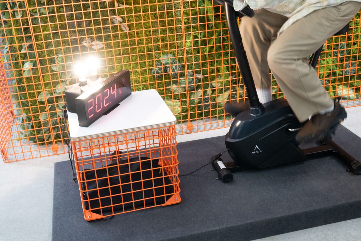 2階では、製品を実際に触ることができるようになっている。また、会場に訪れたらぜひ試したいのが、エアロバイクを使った「自転車発電体験」だ。ペダルを回すことで発電量が表示されるので、 “原宿発電所” のソーラーパネルが発電する200Wを目指して、ぜひチャレンジされたい。