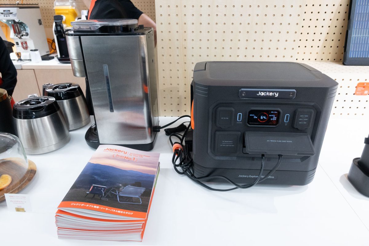 “原宿発電所” という、架空の発電所を掲げる本イベント。建物の屋上には同社のポータブル電源(IP65の防塵防水に対応する「1500 Ultra」)と200Wのソーラーパネルを設置しており、ここで発電した電力を活用するコーヒーの提供も特徴だ(気候や使用電力量などにより、AC充電も併用する場合あり)。